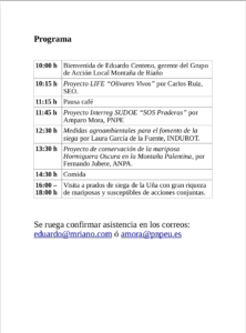 Para completar el encuentro,se invitó a Carlos Ruiz, biólogo de la SEO, que explicó el proyecto LIFE Olivares Vivos (olivaresvivos.com), cuyo objetivo fundamental, muy a semejanza del SOS Praderas, es encontrar nuevas rentabilidades a un agroecosistema, en este caso el olivar, que a su vez lo reconcilien con una gestión respetuosa de sus valores naturales. También participaron en el encuentro Fernando Jubete, de la Asociación de Naturalistas Palentinos, que explicó el proyecto de Acuerdos de Custodia del Territorio con ganaderos locales, financiado por la Fundación Biodiversidad y llevado a cabo en la Montaña Palentina para mejorar el estado de conservación de la mariposa amenazada Hormiguera Oscura (Phengaris nausithous).
